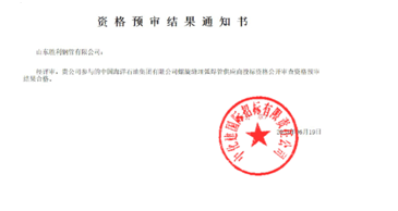 ? 2023年6月19日,山東勝利鋼管有限公司收到中化建國際招標責任有限公司書面通知: “山東勝利鋼管有限公司:經(jīng)評審,貴公司參與的中國海洋石油集團有限公司螺旋縫埋弧焊管供應(yīng)商投標資格公開審查資格預(yù)審結(jié)果合格?!?/span> 這表明,山東勝利成功入圍中國海洋石油集團有限公司的優(yōu)選供應(yīng)商,近三年內(nèi),公司將具備參與中海油螺旋縫埋弧焊管的投標資格。2023年3月24日,中國海洋石油集團有限公司發(fā)出招標公告,就中國海洋石油集團有限公司螺旋縫埋弧焊管供應(yīng)商投標資格公開審查進行國內(nèi)公開招標。我公司積極報名參與投標,經(jīng)過精心準備,于2023年4月7日遞交了資格預(yù)審文件。本次資格審查采用有限數(shù)量制,評審方法使用綜合評審法。審查委員會按資格預(yù)審文件所附評分標準進行打分,在總得分高于75分的申請人中,按照得分排名由高到低的順序選擇前9家(不足9家時全部選?。纬珊蜻x申請人名單,進行現(xiàn)場考察。 資格預(yù)審文件評審結(jié)果我公司排名靠前,順利進入到現(xiàn)場考察階段。2023年5月19日,中國海洋石油集團有限公司考察團對我公司進行了現(xiàn)場考察。 現(xiàn)場考察采用否決制,對資格預(yù)審申請文件內(nèi)容的真實性進行逐項審核??疾靾F重點考察了設(shè)備情況、提供證明文件的真實性及大管線生產(chǎn)記錄。公司各部門精誠合作,積極配合現(xiàn)場考察工作,現(xiàn)場考察順利通過,沒有任何問題,考察團對我公司高度認可。我公司成功通過中國海洋石油集團有限公司供應(yīng)商的書面評審及現(xiàn)場考察,為成功進入中國海洋石油集團有限公司的優(yōu)選供應(yīng)商奠定了堅實的基礎(chǔ)。