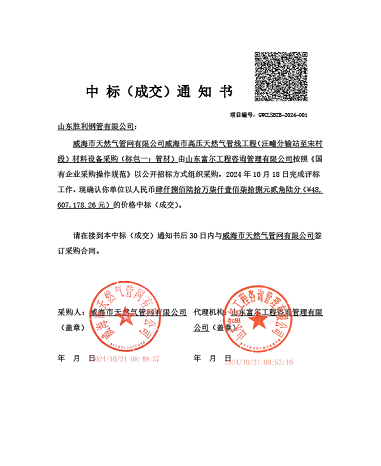 ??近日,山東勝利成功中標(biāo)了威海市高壓天然氣管線工程(汪疃分輸站至宋村段)材料設(shè)備采購的項目,該項目總量8000余噸,標(biāo)志著公司在市場競爭中再次取得了顯著成果,實力得到了市場的廣泛認可。